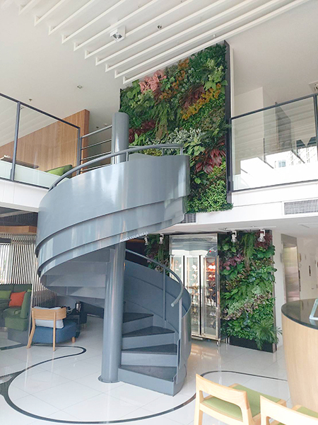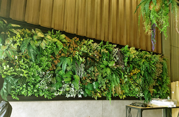 เปลี่ยนบรรยากาศของผนัง ด้วยการเติมแต่งสีสรรเขียวสดแบบธรรมชาติ ด้วยใบไม้เทียมและต้นไม้เทียม เรียกว่าเป็นการจัดพื้นให้เป็น สวนผนังใบไม้เทียม ได้ดูร่มรื่นขึ้นมาทันตา โดยเรียกสั้นๆว่า สวนผนังใบไม้เทียม ที่โรงแรม ZAZZ Urban Bangkok พระราม9 กรุงเทพฯ