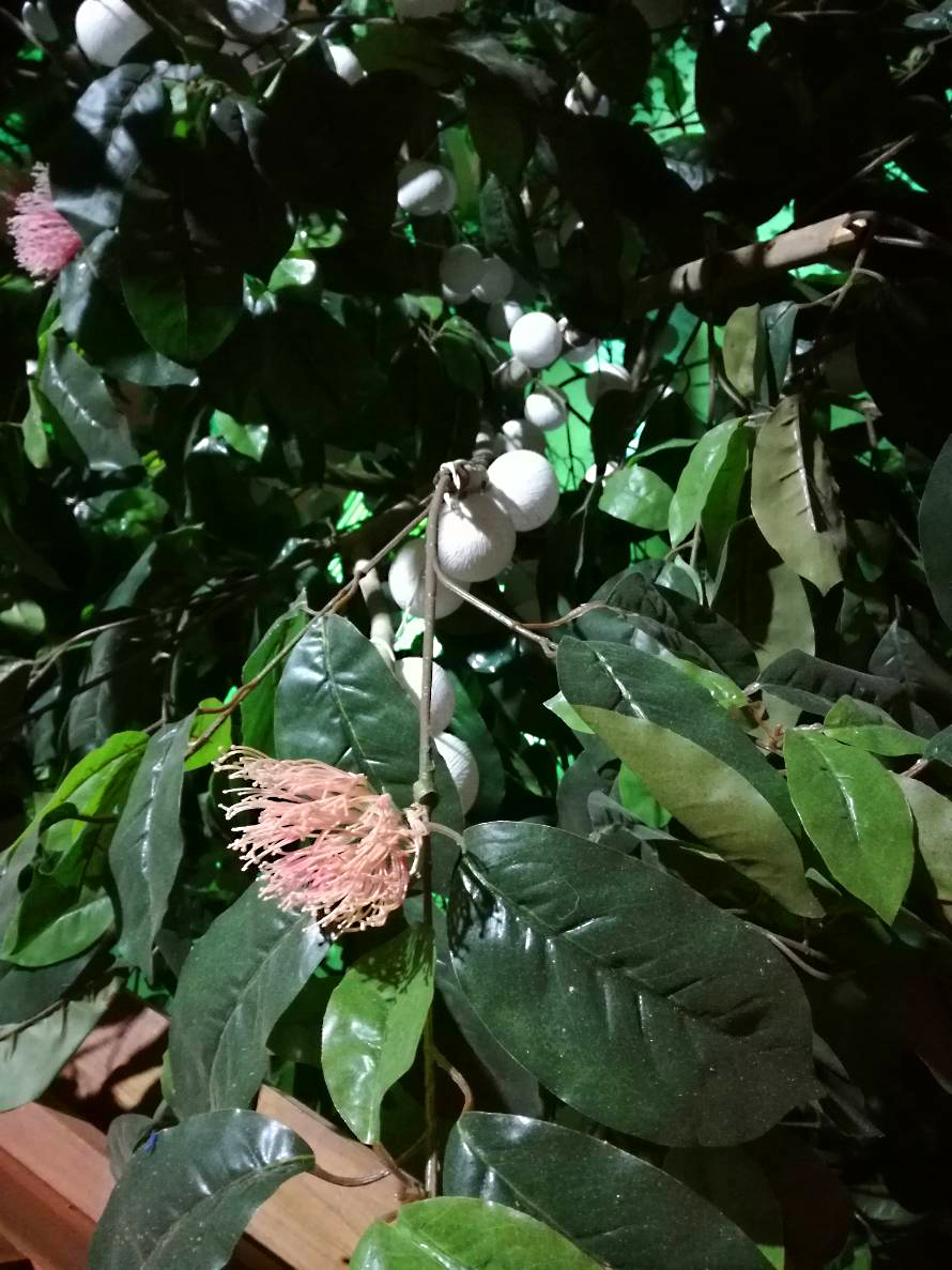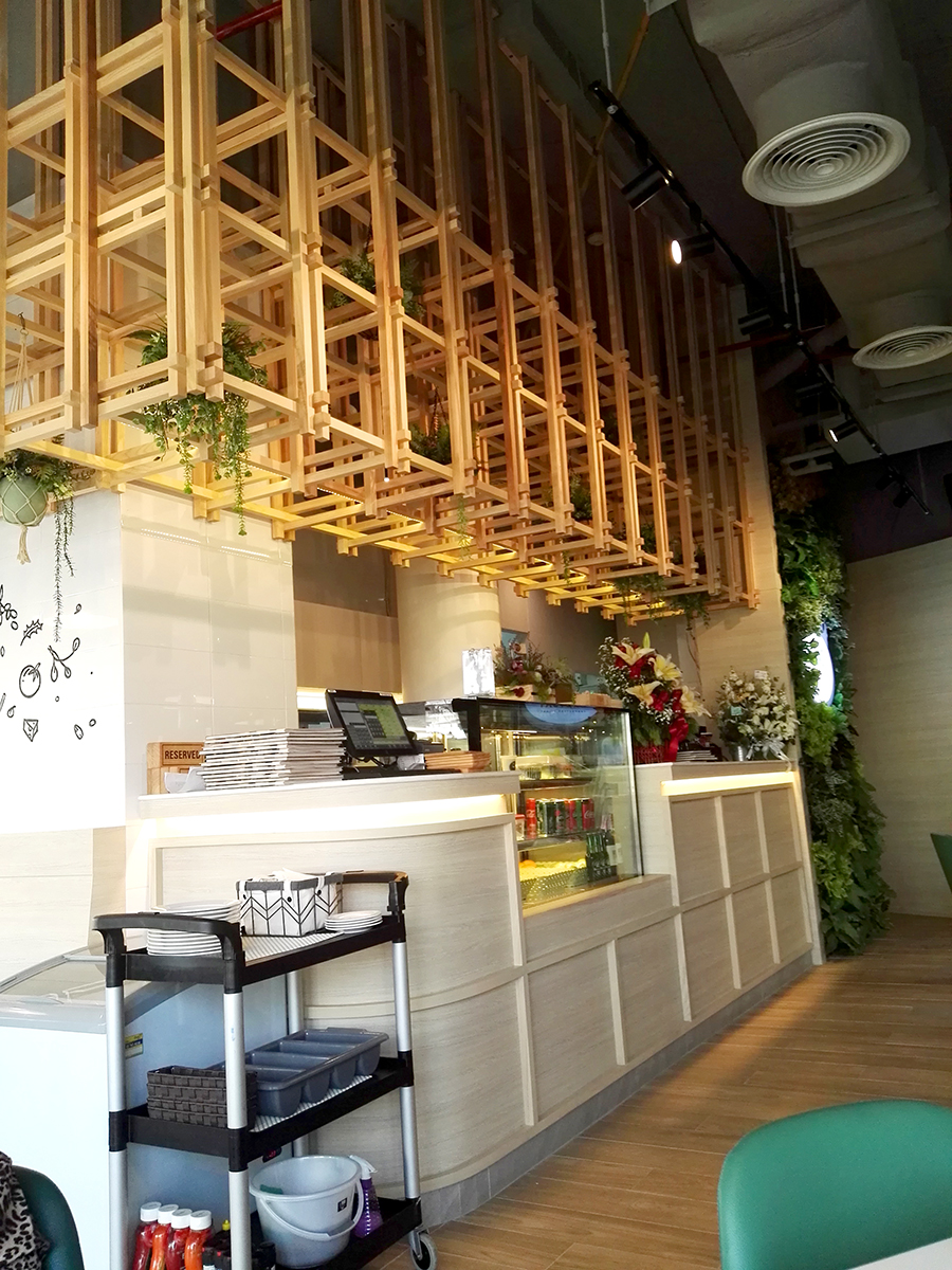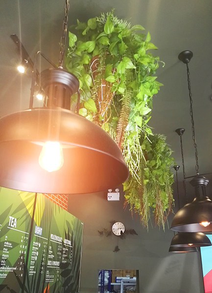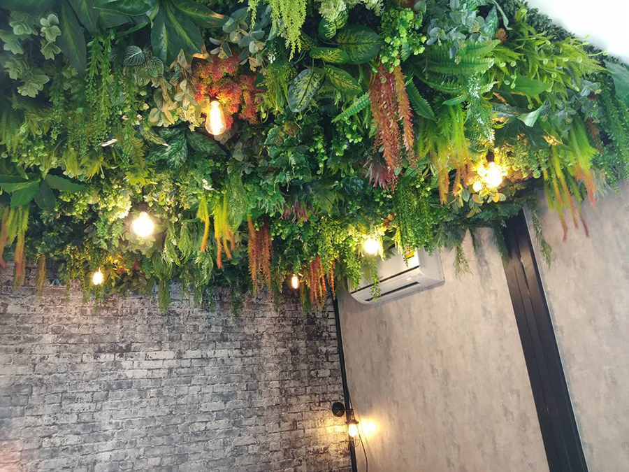 ใบไม้เทียมที่เหมือนจริง ถูกตกแต่งลงไปที่ตัวเสาและเพดานร้านเพื่อให้ได้บรรยากาศสวนต้นไม้ที่ร่มรื่น